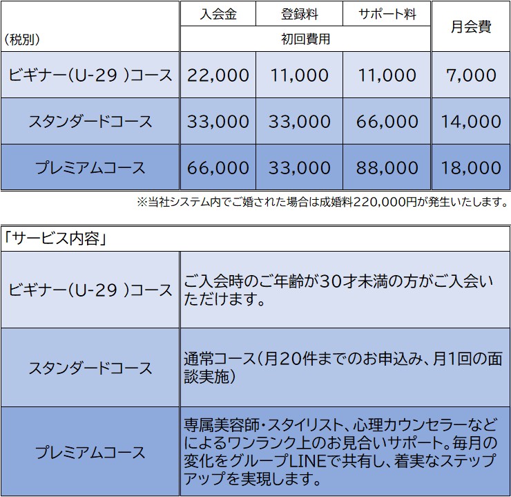 当相談所では、ご年齢やご希望に合わせたコースをご用意しております。料金やサポート内容の詳細は個別にご説明いたしますので、まずはお気軽に無料相談へお越しください。