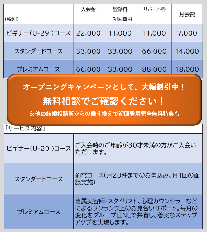 当相談所では、ご年齢やご希望に合わせたコースをご用意しております。料金やサポート内容の詳細は個別にご説明いたしますので、まずはお気軽に無料相談へお越しください。